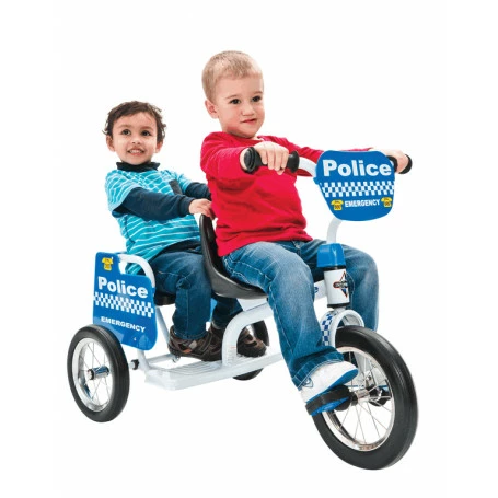 The Eurotrike Police Tandem Trike is perfect for 2 children to interact and play together, or just as much fun for one junior crime fighter too. The 3-wheel design is highly stable with 2 children onboard and is designed for fun and outstanding performance. • Great police car themed graphics • Super strong all steel frame and fork construction • Strong steel spoked wheels • Big, tough, pump up tyres • Safety pedals and grips • High back rider seat with cool fire themed safety flag • Fully enclosed rear passenger seat with teddy bear/doll seatbelt • Large rear footplate • Comfortable safety grips • Length 930mm, width 480mm, H/bar height 635mm, seat height rider 360mm, passenger 315mm • Weight 7.2kg • Max rider weight 40kg combined rider and passenger.