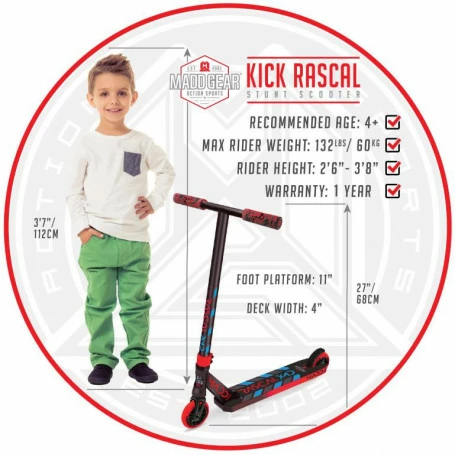 With a shorter deck and lower bars, the Madd Gear Kick Rascal is perfectly balanced and effortless to control for riders 4 years and up. It is the ultimate complete scooter for younger riders new to the sport