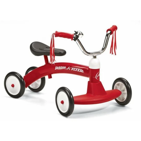 The Scoot About is perfect for any toddler looking to ride in style! The signature red steel frame features a front bumper to protect walls and furnishings, and the wide-set front wheels provide safety and stability. The Scoot About also features easy glide wheels and real steering for a great ride. The handlebars are fashioned in stylish chrome, and your child will love both the real ringing bell and the soft streamers. Plus, the seat is adjustable so this classic toy can grow with your child.