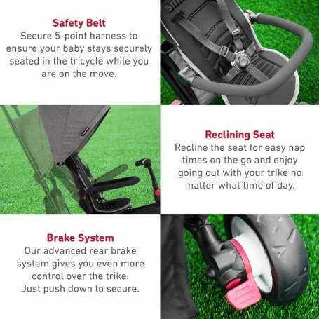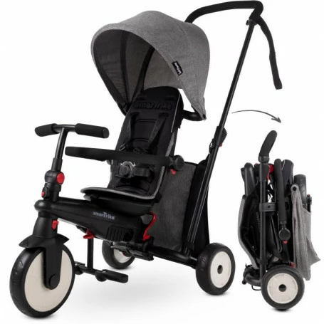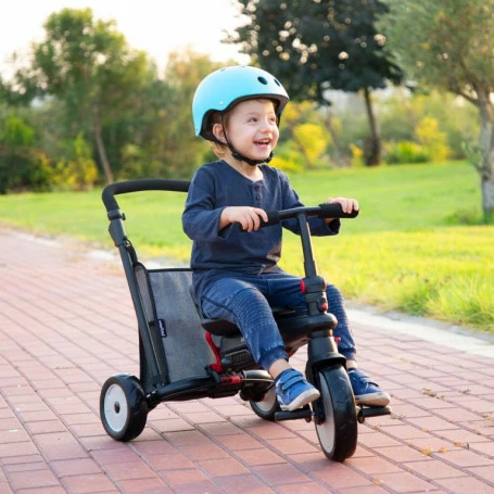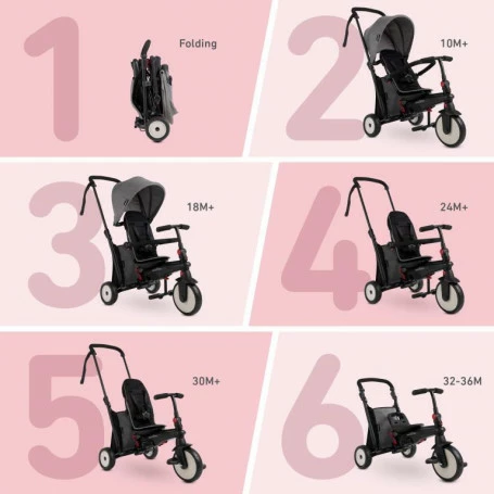 The STR3 Journey 6 in 1 trike is a fully folding baby tricycle with stroller certification. It is designed to grow with your baby from 10-36 months, and folds up compactly, making it the ideal travel choice for families. Our Touch Steering® patent gives the parent effortless manoeuvring control over the toddler trike: lightly touch the parent handle and the push tricycle intuitively steers in the right direction. The STR3 baby tricycle features a reclining seat so your baby can sit upright or nap comfortably on-the-go. It has a full padded seat cover for optimal comfort that can be removed and washed when needed. Packed with safety features, the toddler trike ensures a worry and stress-free ride for all. Featuring a parent-controlled brake system, an adjustable 5-point harness and a safety bar to keep your baby securely buckled in. Super convenient for parents and fun for babies! This trike grows with your baby in 6 stages from a baby push tricycle to an independent toddler tricycle, helping them develop the motor skills, confidence and balance needed for independent riding. Decide who controls the trike. Once old enough, you and your baby can enjoy the dual control function. Easily give control of the trike to your baby, or switch it back into a push tricycle when they are tired or getting frustrated. Enjoy a smooth and comfortable ride with patented shock absorbers and durable, puncture-free EVA wheels. This tricycle is easy to assemble with no tools needed.Stage 1: Folds compactly. Store it conveniently, or wheel it around with the extendable parent handle for easy transportation. Stage 2 (10M+): Reclining seat. Your baby enjoys a comfortable ride with a cozy padded seat cover and a reclining seat, making naptime on-the-go convenient for everyone. Stage 3 (12M+): Comfort & Fun. Your baby enjoys a secure and comfortable ride seated upright, with feet resting on the foldable toddler footrest. Stage 4 (18M+): Develops valuable skills. Remove the canopy and watch your baby develop balance, curiosity and confidence while enjoying a fun ride and wide-eyed view. Stage 5 (24M+): Teaches pedaling. Fold the footrest, remove the safety bar, attach the pedals and use the Control Button to switch between parent & child control to build motor skills while learning to ride. Stage 6 (30-36M+): Supports independence. Remove the high back support and fold the parent handle so your little adventurer can explore the outdoors on a fully independent toddler tricycle.