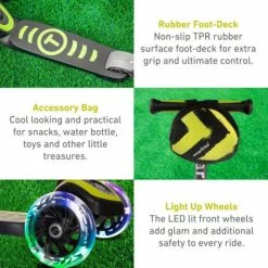 This T5 Scooter by SmarTrike has the following amazing features: β’ TPR rubber surface footplate for extra grip β’ Unique elastomer mechanism design for tilting β’ T-lock system β dual control mode β’ Soft-touch rubber grip handle β’ Telescopic, aluminium handlebar β’ PU wheels β’ Double rear wheel for extra stability β’ Easy-reach rear foot brake β’ Meets safety requirements 50kg/110lb max β’ Trendy bag to fill with accessories β’ LED lit front PU wheel.
